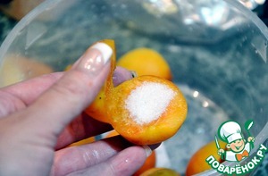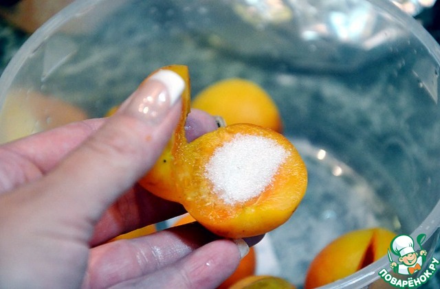 В каждую половинку абрикоса кладем по пять граммов сахара. Накрываем второй половинкой.