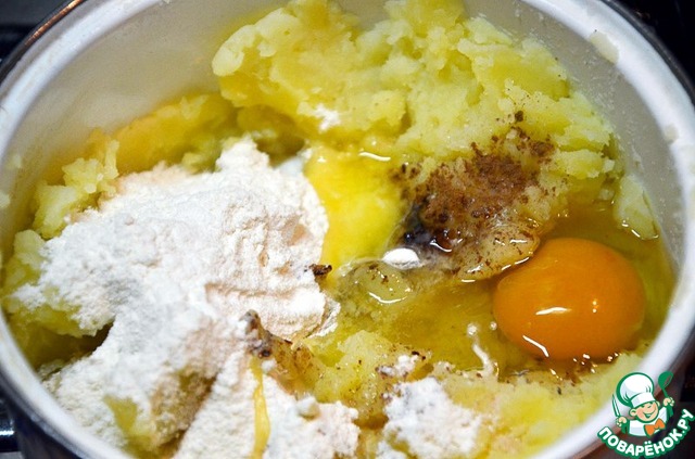 Растапливаем 30 граммов сливочного масла. Перемешиваем картофель с мукой и яйцами. Добавляем соль, корицу и сливочным масло.