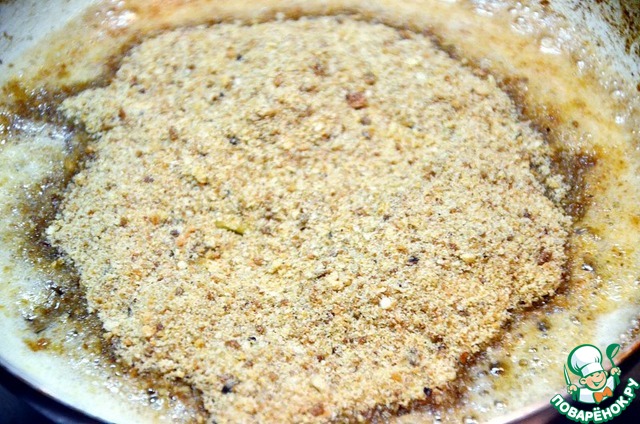Растапливаем сливочное масло. Добавляем в него панировочные сухари. Обжариваем до золотистого цвета.