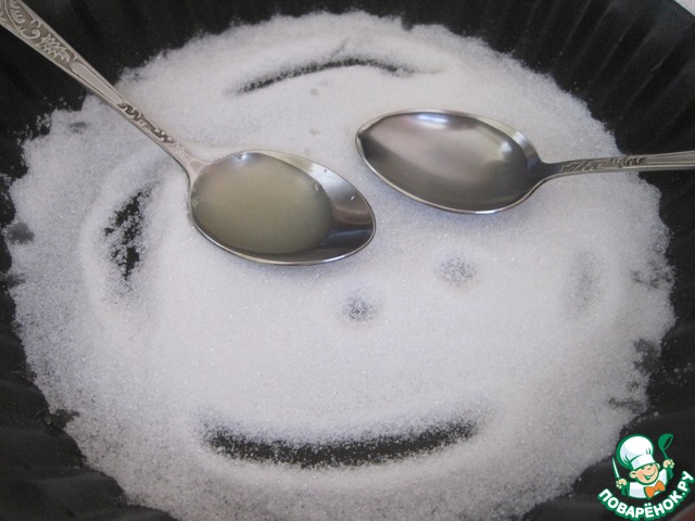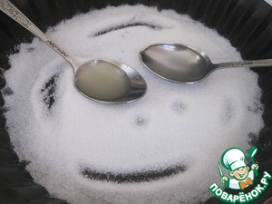 Для начала подготовим НЕРАЗЪЁМНУЮ форму для выпечки и большой противень для кипятка, в который мы потом поставим форму с тестом для выпекания на водяной бане. Духовку включаем для разогрева на 180 градусов. Мерный стакан у меня 250 мл. Ну а теперь приступим. Начинаем с карамели: сахар высыпаем в форму для выпечки, туда же по ложке лимонного сока и воды. Ставим форму на маленький огонь.