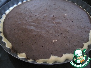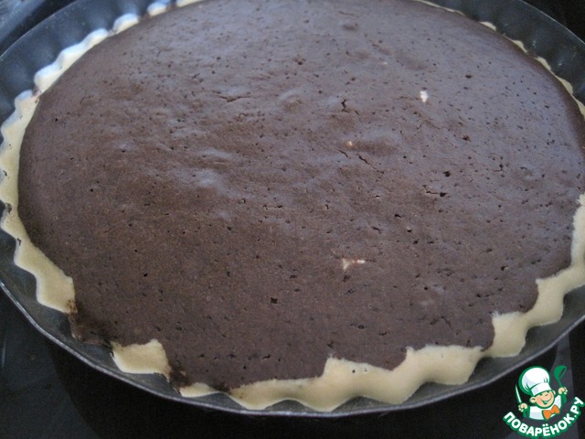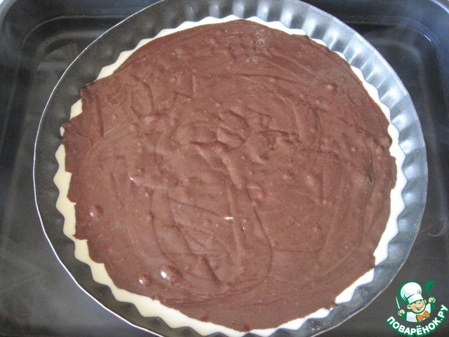 Теперь на застывшую карамель выливаем молочный слой. А на молочный аккуратно выливаем бисквитный слой. Именно на этом этапе в голове промелькнуло-продукты перевела зря! Думала. что бисквитный слой благополучно ляжет на дно, как Титаник. Но... бисквитное тесто выливала аккуратно, по спирали, закрывая им крем. И посмотрите-всё получилось! Форму с тестом ставим в большой противень. Заполняем противень кипящей водой так, что бы форма с тестом на треть была в кипящей воде.