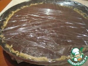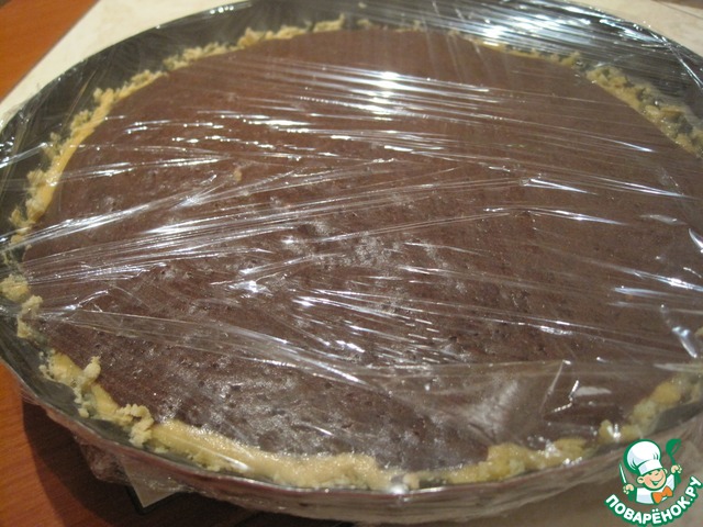 Даём нашему красавцу полностью остыть в форме, не вынимая её из воды. Далее вынимаем форму из противня с водой, проводим ножом по стенкам формы, затягиваем форму пищевой плёнкой и отправляем на ночь в холодильник. Во времени приготовления я не указала время на выстаивание пирога в холодильнике.