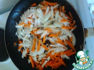 • Морковь нарезать на брусочки, лук порезать на кусочки, и немного обжарить, добавить томатную пасту.