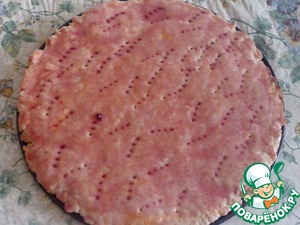 Песочное тесто достать из холодильника, раскатать на дне разъемной формы (d=28 см). Наколоть вилкой.