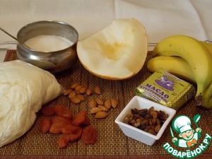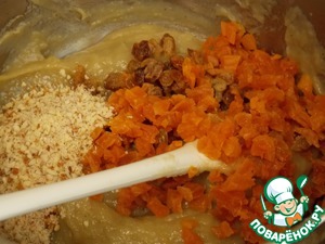 За это время промыть изюм, порезать курагу, а орехи перемолоть. Положить затем в уваренную смесь, перемешать.