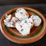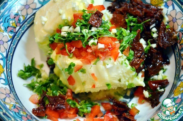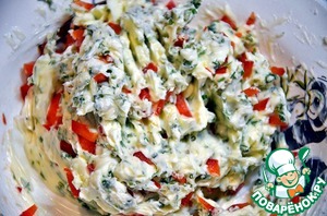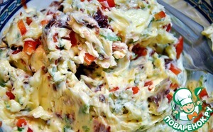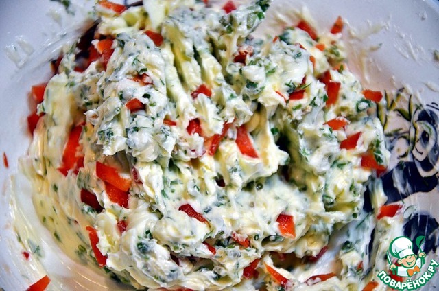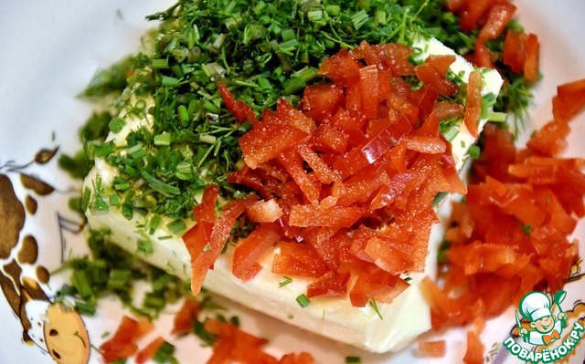 • Начинка три: смешиваем мелко нарезанный красный сладкий перец (1/4 часть), мелко нарезанные вяленые томаты, укроп, петрушку, чеснок.