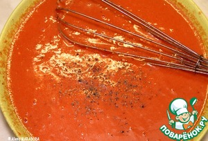 Готовим соус: кладем в глубокую миску для взбивания: яйца, томатную пасту, воду, рассол от маслин- взбиваем тщательно венчиком до однородной массы. Добавляем растительное масло, сахар, сок выжатой дольки лимона, понемногу добавляем муку (обязательно просеивая ее через сито- тем самым мы насыщаем муку кислородом). Взбиваем соус до консистенции однородной жидкой сметаны.