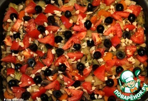 Равномерно раскладываем сверху нарезанные помидоры и маслины, посыпаем чесноком.