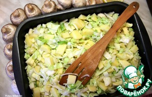 Перемешиваем картофель, капусту и лук. Отправляем в разогретый духовой шкаф на 25 минут на 200ºС.
