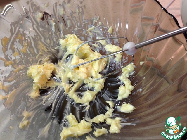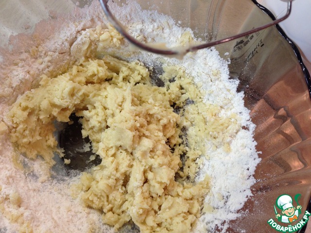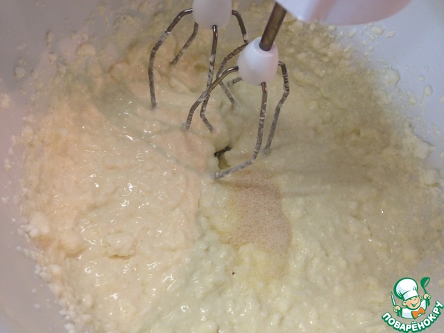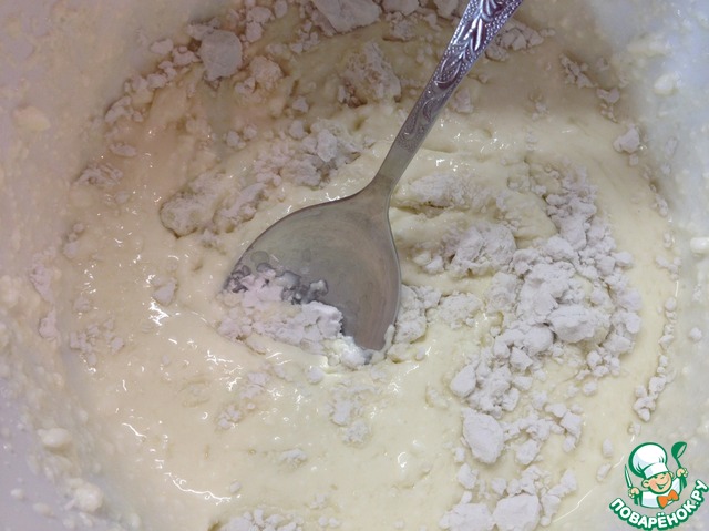 Добавляем муку и перемешиваем миксером на маленькой скорости.
