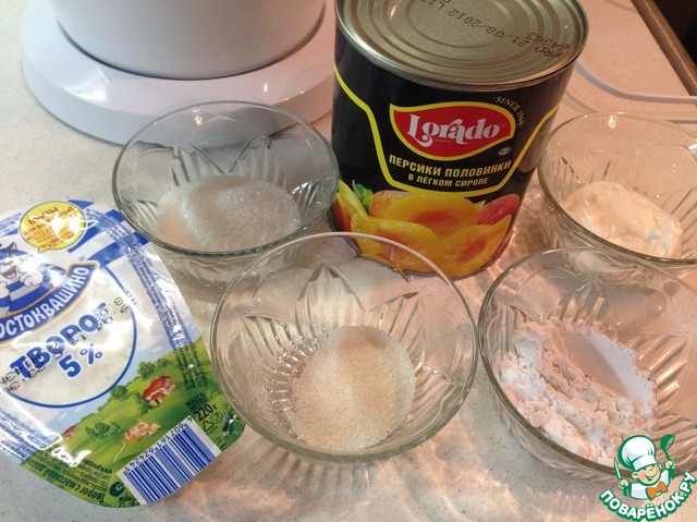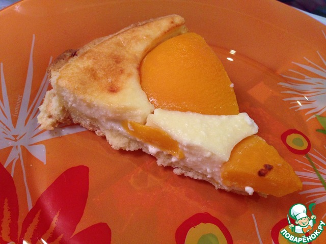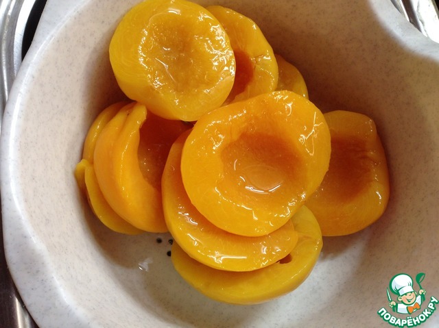 Выкладываем половинки персиков на крем, но не придавливаем их пальчиками, так как в процессе выпекания, они сами опустятся.