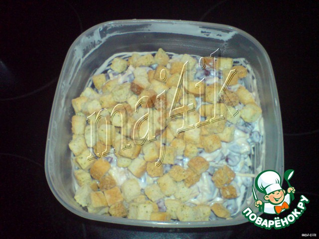 +++++! Майечка, я делаю такой салатик, очень вкусно. Я только беру ржаные сухарики и сыр режу мелкими кубиками.