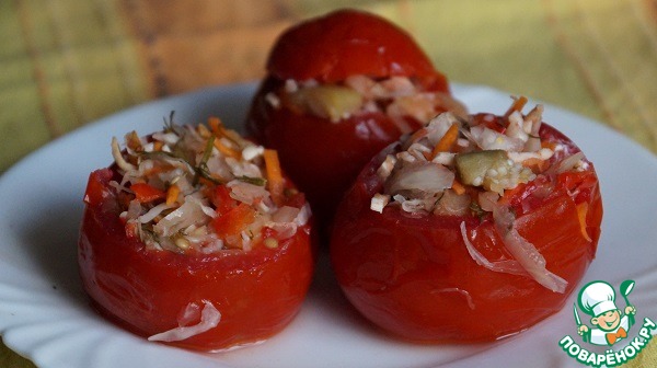 Шикарный рецепт! Идеально по соли. Из моих изменений - все овощи для начинки тонко нашинковала. Добавила в начинку капусту и чуть приваренный (4 минуты в микро) баклажан. ОЧЕНЬ вкусные помидоры! Спасибо за рецепт!