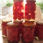 В 1,5-литровую банку у меня вошло от 900 до 950 гр помидоров. Значит, на 18 банок по 1,5 л у меня ушло около 17-17,5 кг помидоров.