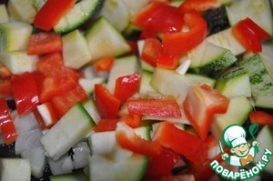 Кладём цуккини, чеснок и болгарский перец, перемешиваем.