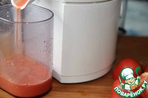 Из спелых помидоров с помощью соковыжималки делаем свежевыжатый томатный сок.