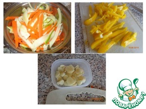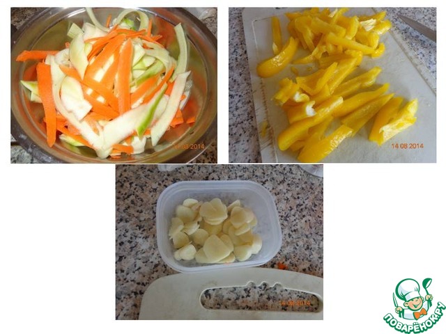 Молодые кабачки и морковь очищаем от кожуры и нарезаем тонкими полосками, я делаю это с помощью овощечистки. Болгарский перец очищаем от семян и нарезаем тонкими полосками. Чеснок режу пластинками.
