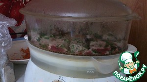 Сначала режем мясо на маленькие кусочки, солим его, добавляем специи и зелень, затем выкладываем на первый уровень пароварки и ставим на 40 минут (может, мясо приготовится и быстрее, но я решила подольше его попарить, так как боялась, как бы оно не было жестким)