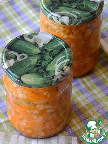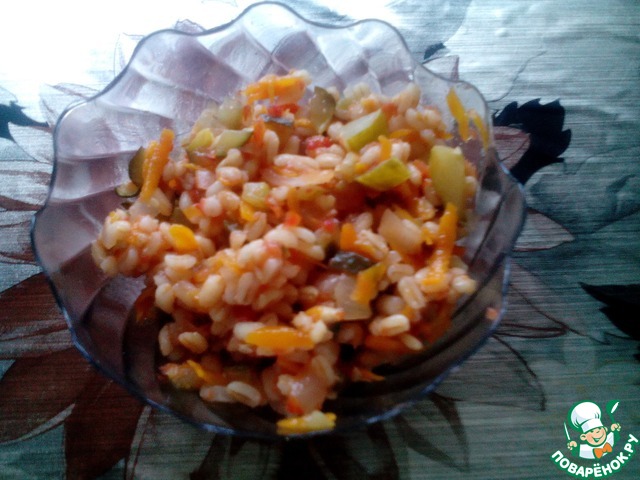 Затем добавить огурцы, лук, морковь, перловку и перемешать.