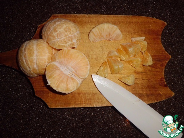 Приступим... Мандарины очищаем, делим на дольки и нарезаем на кусочки. Складываем в любую ёмкость и убираем в морозильную камеру.