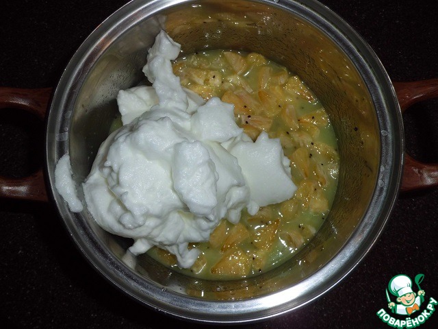 Белки взбиваем в крепкую пену и отправляем к остальным продуктам. Аккуратно вмешиваем в общую массу.