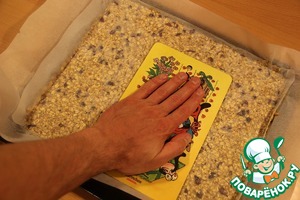 Если вы не хотите возиться и лепить печенье, просто выложите всю массу на противень, застеленный бумагой для выпечки. Накройте второй бумагой и выровняйте при помощи досточки, чуть придавливая массу.