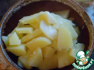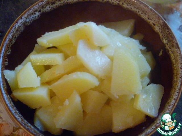 Тем временем варим на пару очищенный и порезанный на кусочки картофель в течении 30 минут.