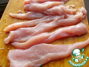 Нарезать грудку тонкими полосками, лучше если она немного подморожена.