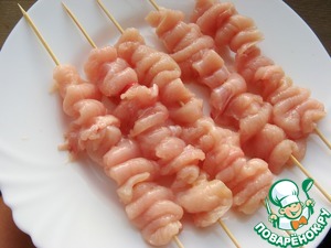Нанизать мясо на деревянные шпажки в виде гармошки.