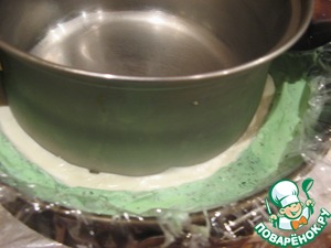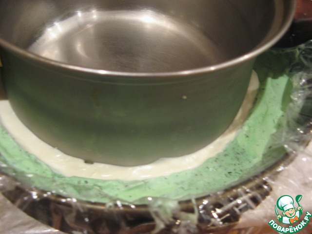 Разъемную форму выложить пленкой, поставить в середину кастрюлю и в просвет между ними выложить мятное мороженое и поставить в морозилку.