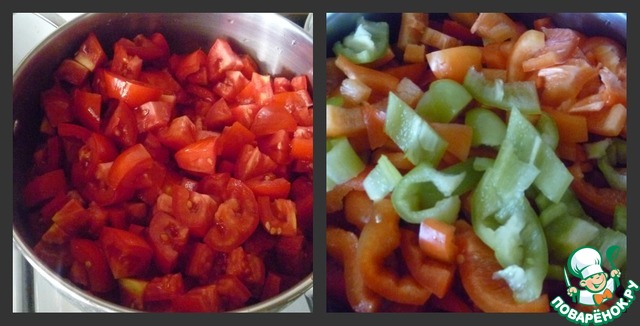 Помидоры, перец вымыть. У перца удалить семена. Порезать как Вам больше нравится. Сложить в кастрюлю, поставить на огонь. Тушить 20 минут после закипания.