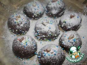 Посыпаем сахарной пудрой, украшаем кондитерской посыпкой. Ставим в морозильную камеру хотя бы на полчаса.