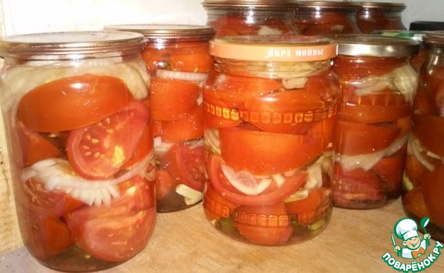 Нарезаем лук кольцами полщиной 3-4 мм и помидоры на четвертинки. Складываем все слоями в банки - кольца лука и дольки помидоров (чем больше лука тем вкусней, но без фанатизма ;) ). -