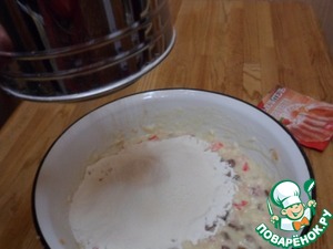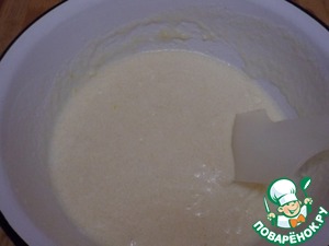 Муку смешать с разрыхлителем теста. Ввести, просеивая, в манную массу.