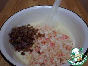 Изюм и яблоки добавить к манной массе, перемешать и оставить на 15 мин.