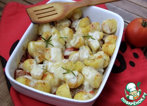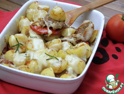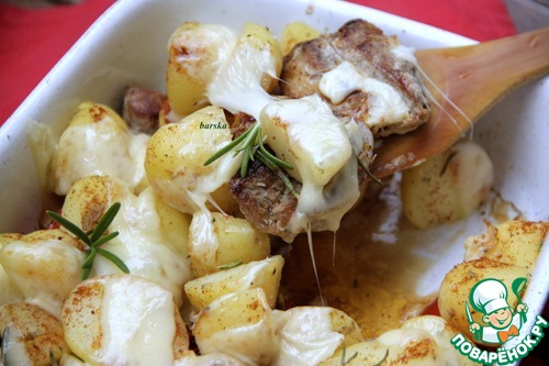 Розмариновый картофель можно также приготовить и др. способом - предварительно запечь для гратена: вымыть картофель, нарезать небольшими дольками или четвертинками, посолить, сбрызнуть оливковым маслом, добавить розмарин и запекать при 180*С до готовности. И тогда к картофелю подкладывать сверху подготовленное жареное мясо и томаты + сыр, увеличив тем-ру до 220*С на 10 мин. -