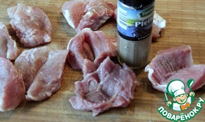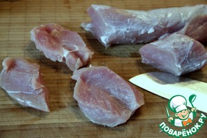 Филе свинины помыть, просушить бумажными полотенцами, удалить острым ножом внешние сухожилия и плёночки. Нарезать толстыми кусочками по 4 см. Затем каждый кусочек надрезать посередине, но не до конца, и развернуть, как бабочку.