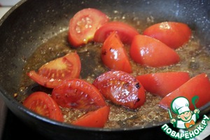 На оставшемся жиру и выделившемся мясном соке быстро обжарить нарезанные дольками помидоры с обеих сторон (помидоры должны быть сладкие!)