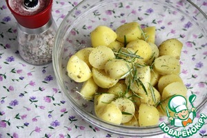 Отваренный предварительно в мундире картофель очистить (молодой можно не очищать), посолить морской солью и добавить иголки розмарина.
