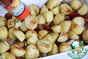 В большую форму для запекания выложить обжаренное теплое филе, между ним - обжаренные томаты, сверху распределить картофель и посыпать сушеной красной сладкой паприкой.