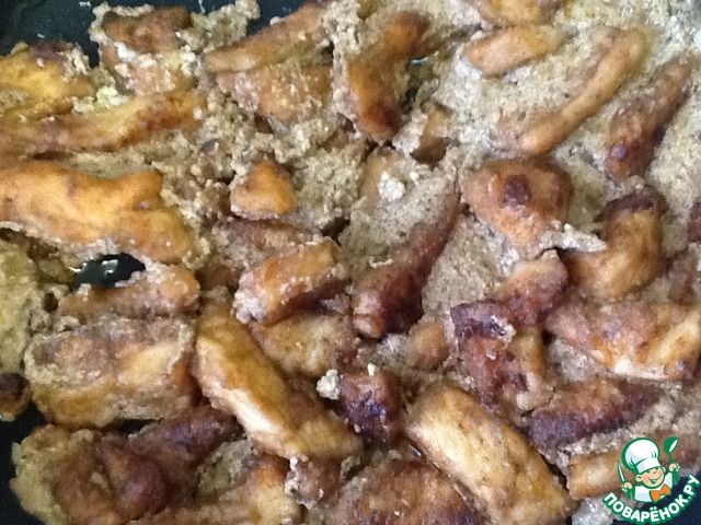 Обвалять кусочки мяса в панировке и обтрусить (всё хорошо в меру).