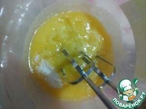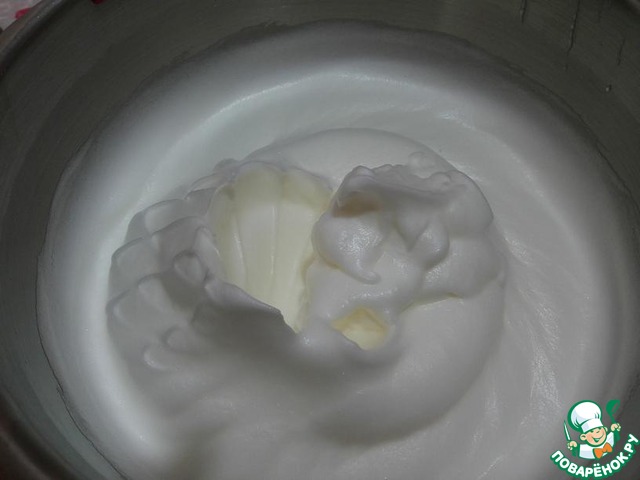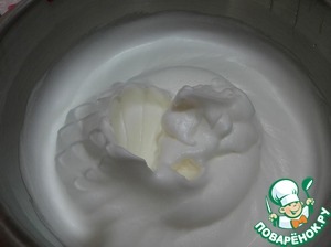 Добавить к нему мучную смесь и перемешать. Взбить белки до пены и затем добавить 40 г сахара, взбить до устойчивой пены.