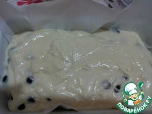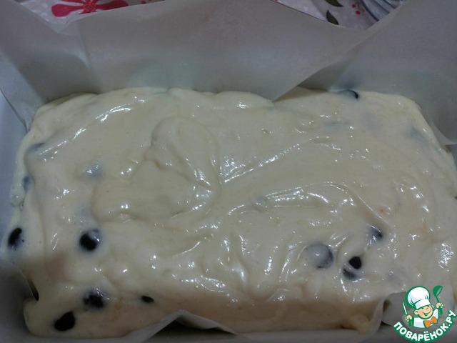Форму выложить пергаментом ( у меня размер 13 на 24 см) и выложить тесто.
