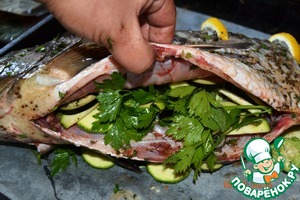 Положить карпа, во внутрь заложить оставшиеся овощи