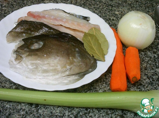 Для этого блюда необходимо заранее приготовить рыбный бульон. Суповой набор рыбный, лук, морковь, сельдерей, лавровый лист варить в течение одного часа, посолить. Процедить.