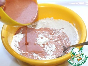 Берем миску с мукой. Понемногу вливаем томатную смесь, перемешиваем. Третий стакан с мукой подсыпаем после замеса. Муки может уйти чуть меньше или чуть больше.