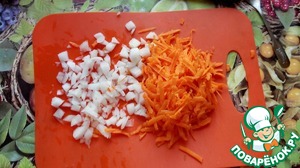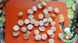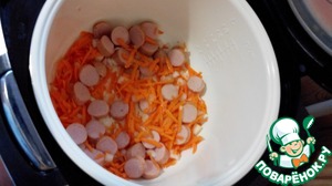 Добавить немного растительного масла и положить морковь, лук и сосиски в мультиварку