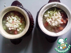 Распределяем овощи в горшочки. но - чеснок должен быть сверху всего!!. заливаем соком из кабачков. ВНИМАНИЕ!!! жидкость не должна быть под самые края горшочков. учтите что соус будет кипеть, и может расплескаться из под крышки. теперь добавляем соль, перец. можете также добавить специи по желанию. накрываем горшочки крышками и отправляем в духовку на 35-40 минут.