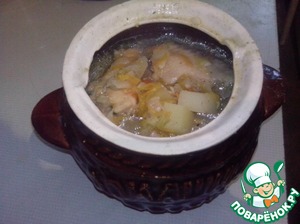 Раскладываем мяско по 2 половинки в каждый горшочек