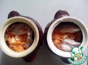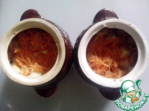 Раскладываем картофель, лук и морковь в горшочки. эти ингредиенты лучше перемешать